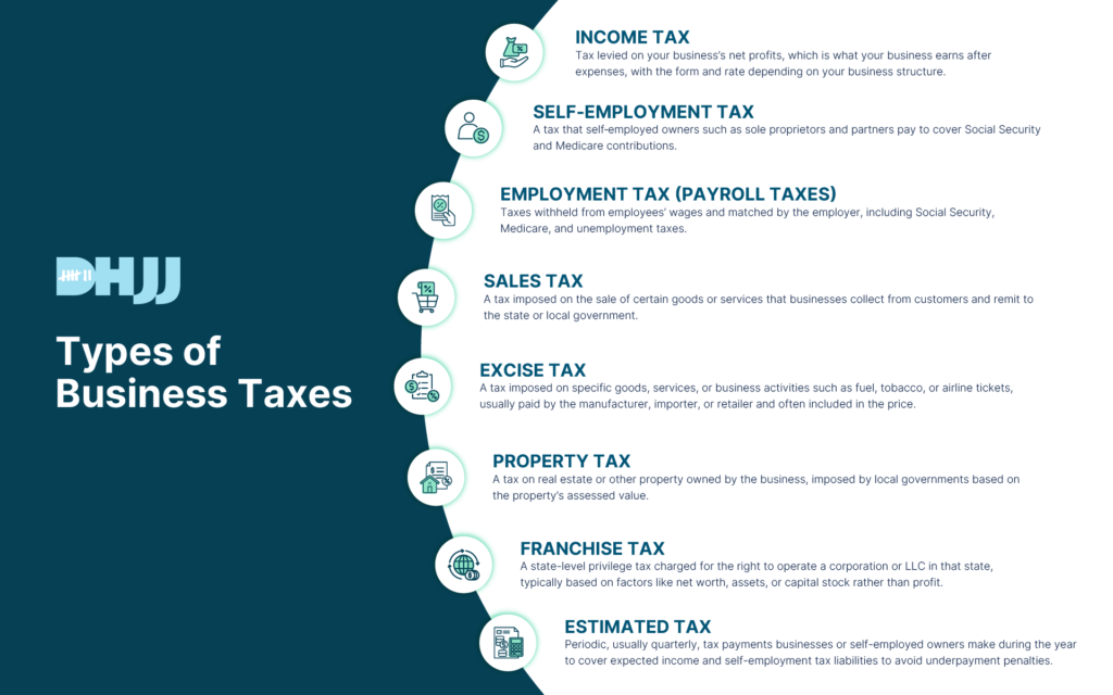 Understanding the types of business taxes is the first step to staying compliant and protecting your bottom line. At DHJJ, we help business owners take control of their tax strategy through proactive planning and personalized advice.